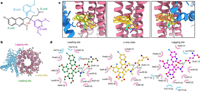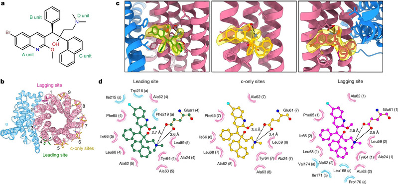 Die typischsten Derivate von Bedaquilin sind TBAJ-587 und TBAJ-876, und die ausgesuchten Arzneimittel sind bereits Teil klinischer Studien. Das Forschungsteam deckte die hochaufgelöste Kryo-EM-Struktur der ATP-Synthase von Mycobacterium tuberculosis im Bindungszustand mit TBAJ-587 auf (Abbildung 2). Die Struktur zeigte, dass TBAJ-587 das gleiche Bindungsmuster wie Mycobacterium tuberculosis, ATP-Synthase und Bedaquilin aufwies. Darüber hinaus interagieren sowohl TBAJ-587 als auch Bedaquilin mit der ATP-Synthase von Mycobacterium tuberculosis, hauptsächlich über die Gruppen A und D.