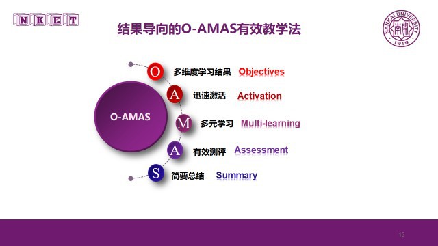 O-AMAS Teaching ModelRooted in Nankai University’s context, inheriting its culture and aiming to solve its problems, O-AMAS is an outcome-oriented effective teaching model developed independently by Nankai Effective Teaching (NKET) in 2017. O-AMAS effective teaching model has adopted the designing idea of OBE teaching, which includes five parts, namely designing of teaching Objective (O), rapid Activation (A), Multi-learning (M), effective Assessment (A) and brief Summary (S). Oriented by the ou